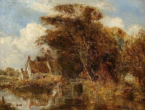 Cottage by a lakeside with figures