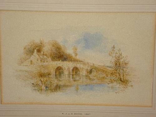 River scene with cottage by a stone bridge