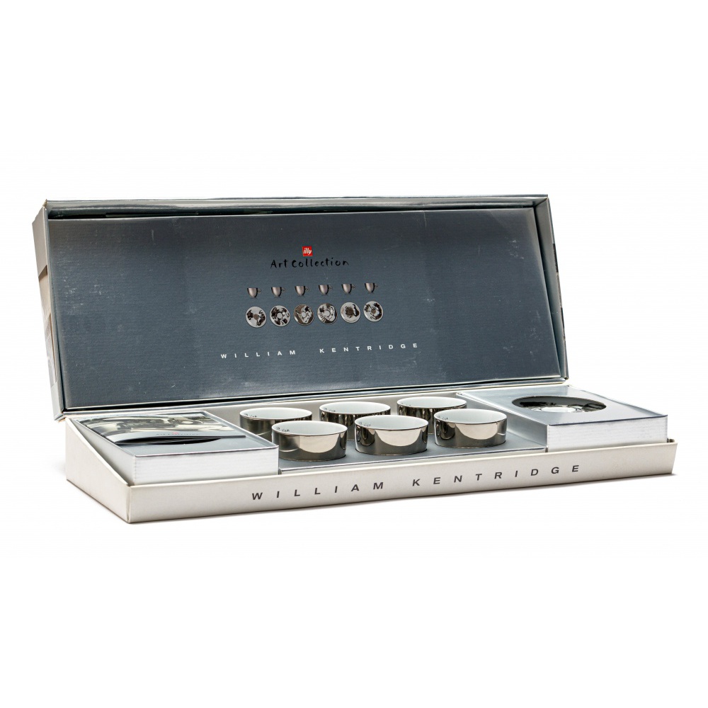 | Ceramic cups with silver mirrored glaze; ceramic saucers with transfer illustration | |