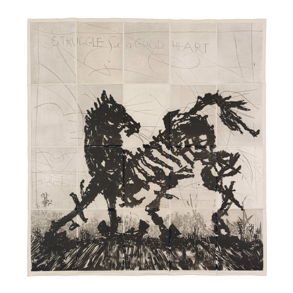 cloth size: 160 by 150cm, portfolio size: 35 by 36 by 3cm and numbered EV 5/10 in red conté in the margin | |