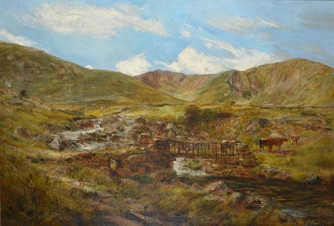 WELSH LANSCAPE WITH FIGURES AND CATTLE CROSSING BRIDGE