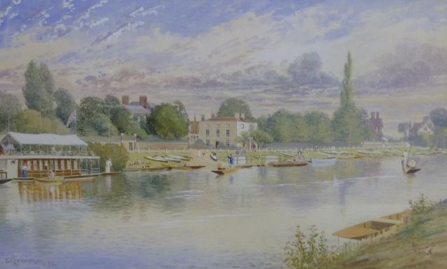 | Boating on an English river, a boathouse and punts on the bank before a Georgian house | |