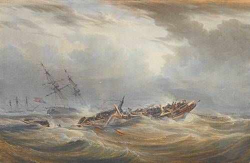 A dismasted vessel in the teeth of a storm