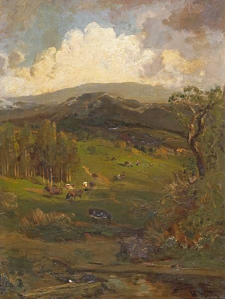 Cattle Grazing among Rolling Hills and Cloudy Skies