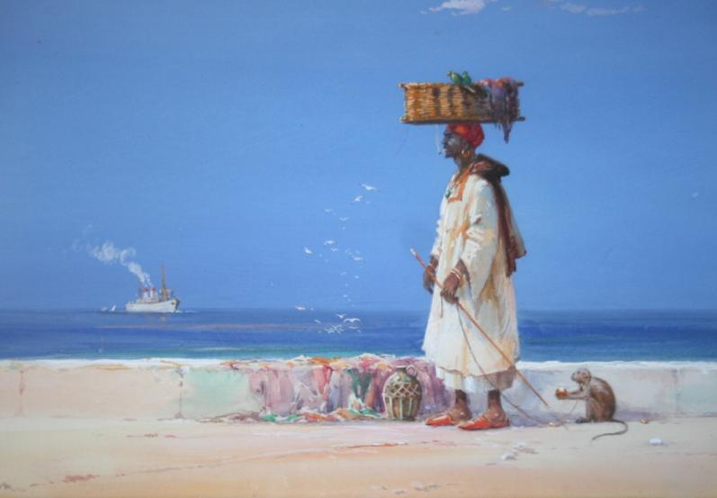 ARAB MERCHANT WITH A MONKEY AT A WATERFRONT
