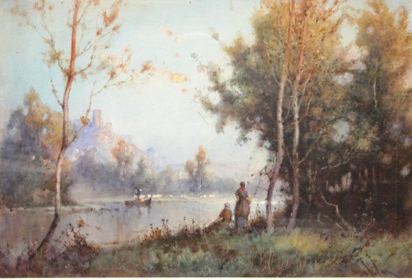 | River scene with figures on bank and figures in a boat, surrounded by trees | |