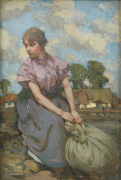 Young woman seated with washing by a stream with farm buildings beyond