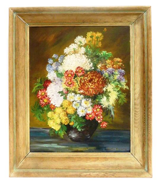 | Still life depicting an assortment of brightly colored carnations in a bulbous vase | |