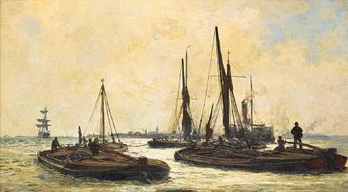 | Barges working their way up the estuary at twilight, heading for London docks | |
