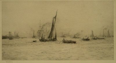| 'Blackwall Reach' busy estuary scene with steam boats and sailing barges | |