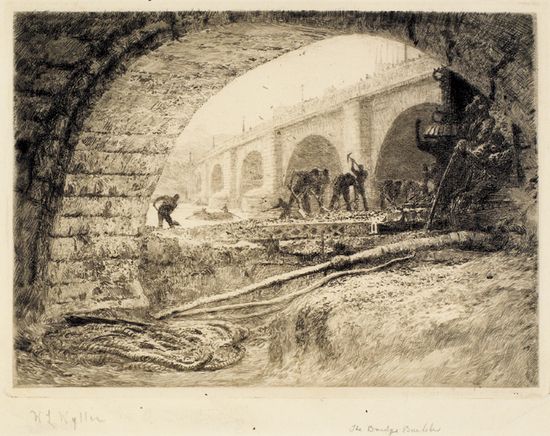| The Bridge Builders, view of workers on the embankment below the old London Bridge | |