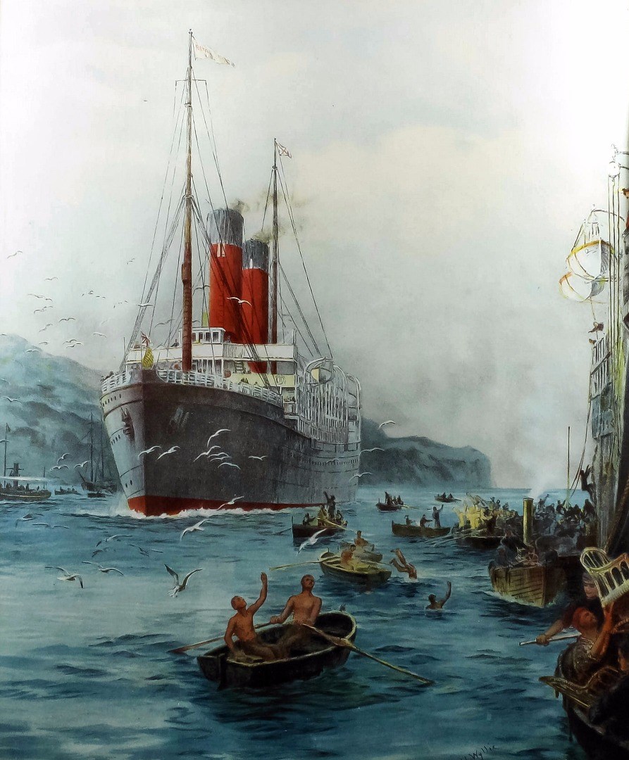 | "Union Castle Line" - Ship arriving in port with numerous figures in small boats and steamers | |
