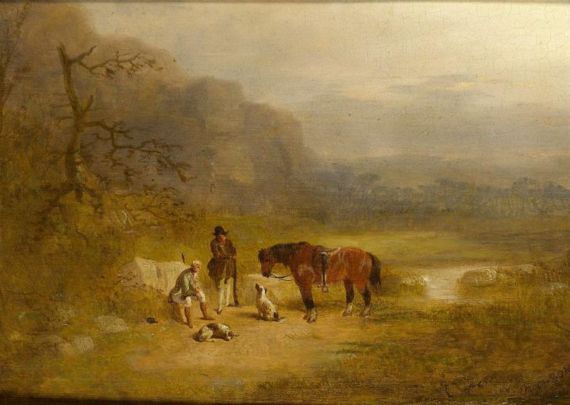 TWO SPORTSMEN WITH A PONY AND THEIR DOGS IN A MOUNTAINOUS LANDSCAPE