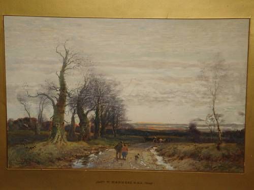 | A woodland landscape with figures and dog on a pathway at dusk | |