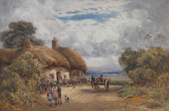 | Children and figures outside a thatched cottage, view to town beyond | |