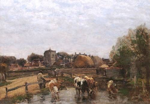 Cattle watering in a village pond
