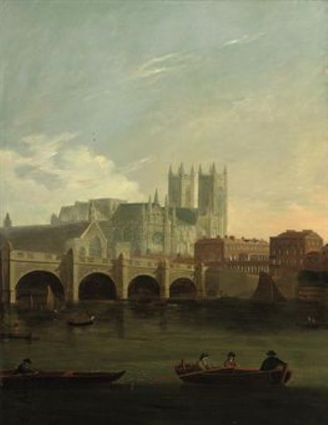 | A view of Westminster Bridge with figures and boats on the Thames | |
