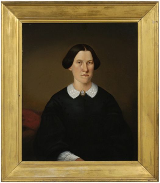| half portrait of woman with brown hair wearing a cameo and lace collar | |