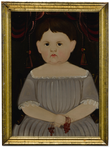 PORTRAIT OF A CHILD IN GRAY HOLDING RED BERRIES