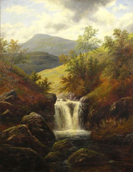 MOUNTAINOUS LANDSCAPE WITH A WATERFALL WITH SHEEP ON THE HILL