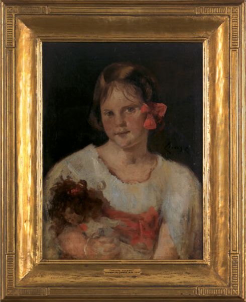| portrait of the artist's daughter, Helen Velasquez Chase, wearing a white dress with a red bow in her hair and holding her doll | |