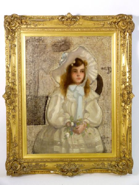 PORTRAIT OF A GIRL, SEATED THREE QUARTER LENGTH IN A WHITE DRESS AND HAT