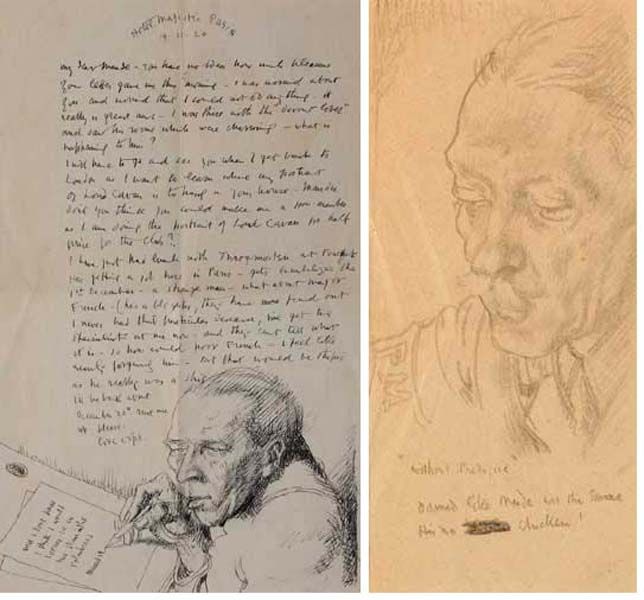 | WITHOUT PREJUDICE - PENCIL SKETCH OF MAJOR RALPH WALTER MAUDE and ILLUSTRATED LETTER TO MAJOR MAUD, 1920 (A PAIR) | |