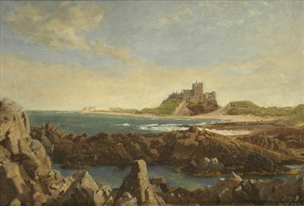 A coastal view with a castle in the distance believed to be Bamburgh castle