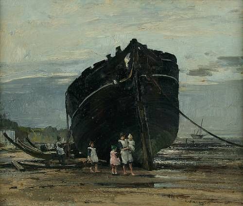 Children by a boat, low tide