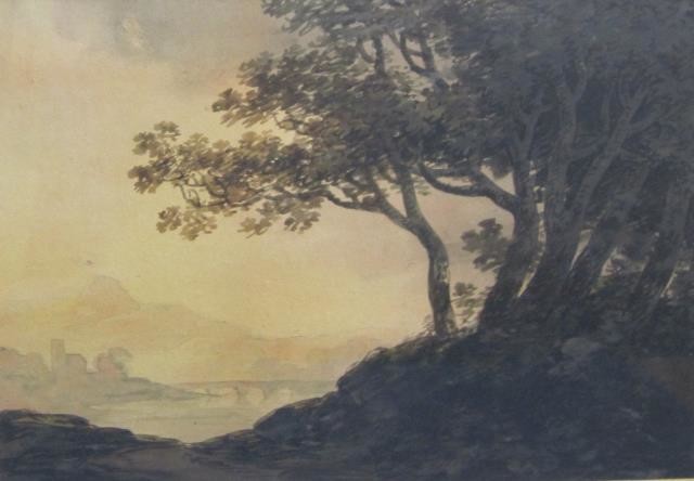 A wooded river landscape, said to be Holt Bridge, on the River Dee