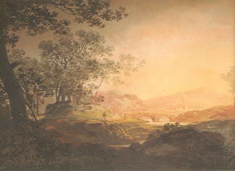 FIGURE IN A WOODED RIVER LANDSCAPE WITH A BRIDGE