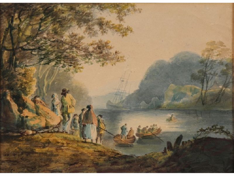 The Ferry, figures on a riverbank, three-master at anchor beyond
