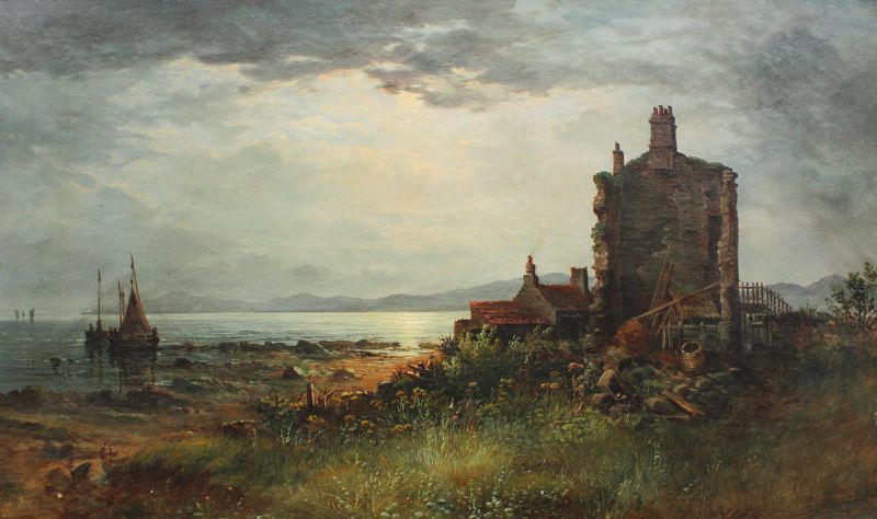 Nocturnal Moonlit Shoreline Scene with Boats and Cottage