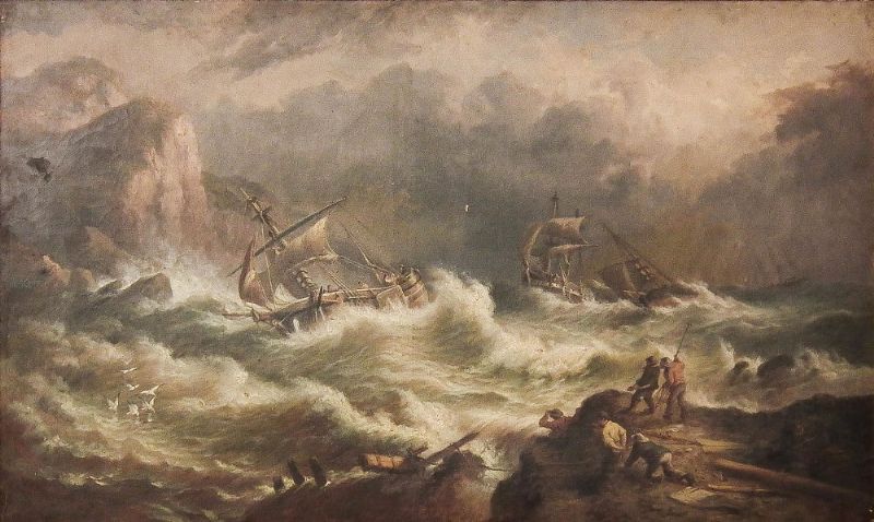 Stormy seas with shipwrecks and with figures to cliff to foreground