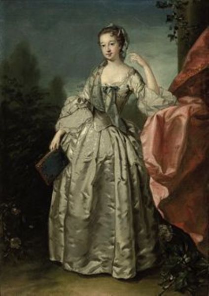 | Portrait of a lady, traditionally identified as Miss Grace Stewart, full-length, in a grey satin dress and blue shawl, a book in | |