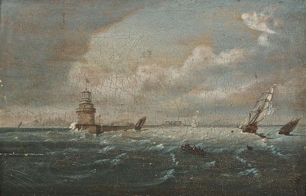 | Shipping at the entrance to Dublin Harbour with the South Wall Light and the Pigeon House and Magazine beyond | |