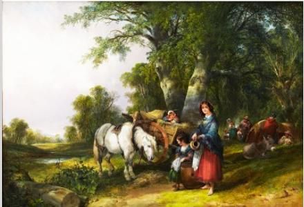 GYPSY WOMAN TENDING TO HER CHILDREN IN A WOODLAND