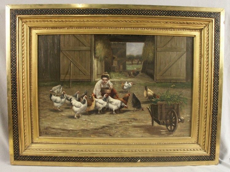 WOMAN FEEDING CHICKENS