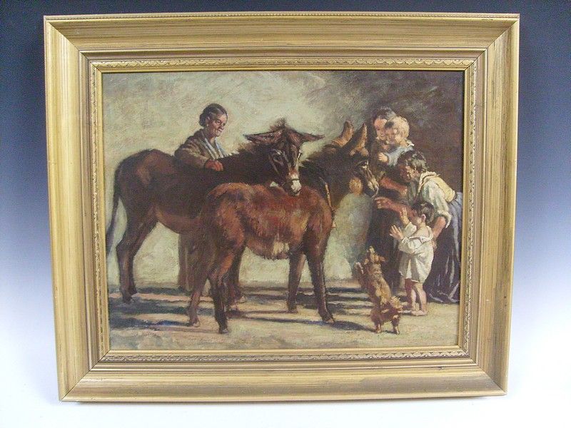 Donkeys with ladies and children accomanied by a dog
