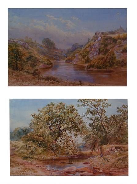 | A rural river landscape with church in the distance, together with another, a wooded river gorge | |