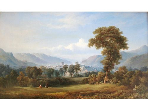 LANDSCAPE SCENE WITH A TOWN IN A VALLEY AMIDST HILLS