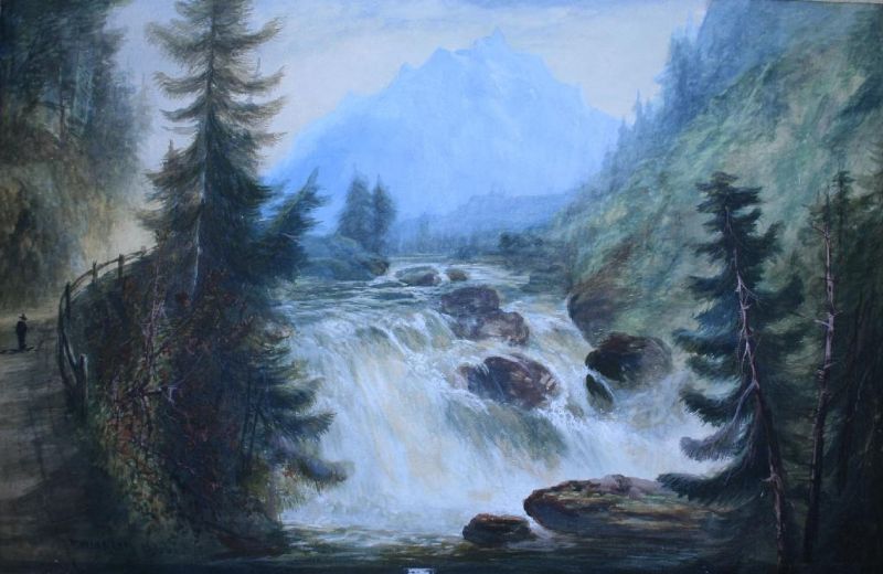 | FIGURE BY A ROCKY WATERFALL IN A MOUNTAINOUS LANDSCAPE | |