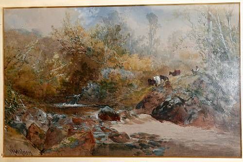 Rocky stream with figure and cattle on the bank