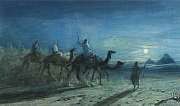 Desert scene with figures and camels approaching pyramids