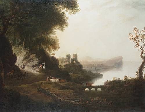 | A mountainous river landscape with soldiers on a country path and a drover with his cattle crossing a bridge | |