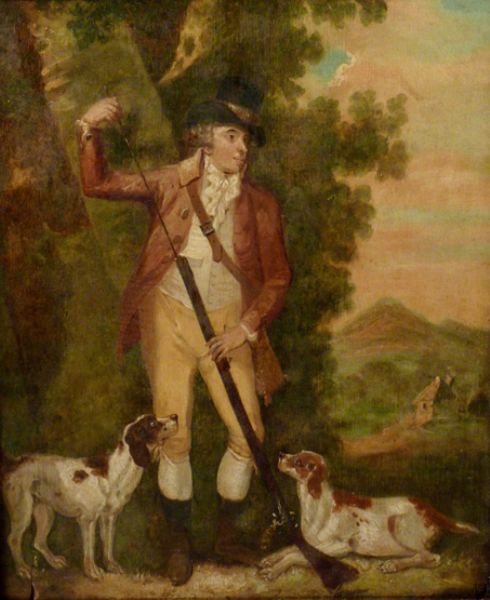 | PORTRAIT OF A SPORTSMAN CLEANING HIS FOWLING PIECE, WITH HOUNDS BY HIS SIDE, IN A WOODED LANDSCAPE | |