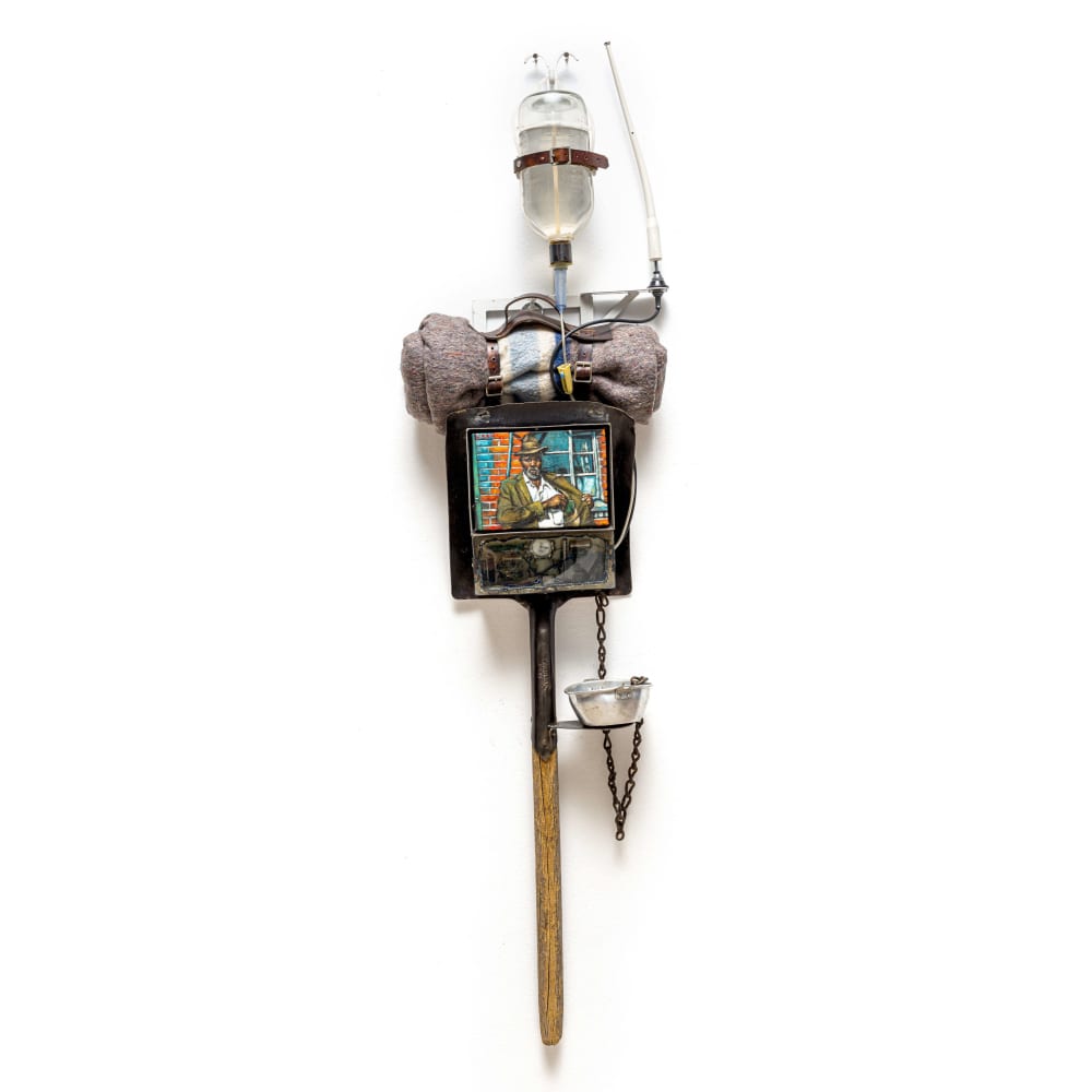 | Mixed Media with found objects and oil on canvas laid down on board | |