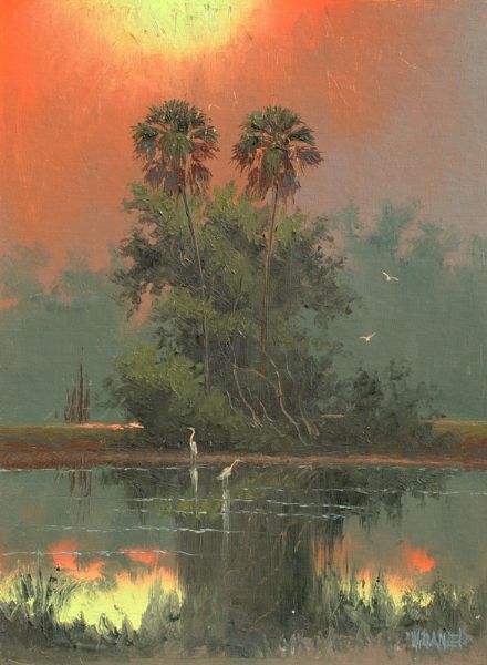 Florida Highwayman sunset backwaters scene with birds and palm trees