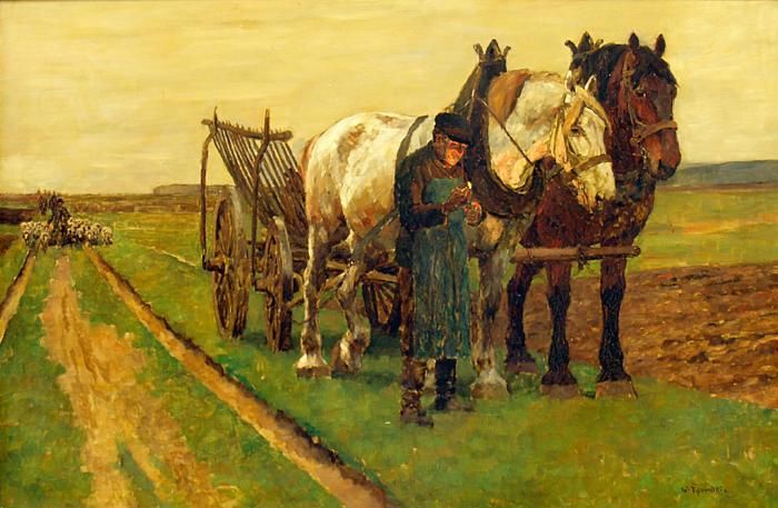 Bauer mit seinem Pferdefuhrwerk an einem Feldweg stehend