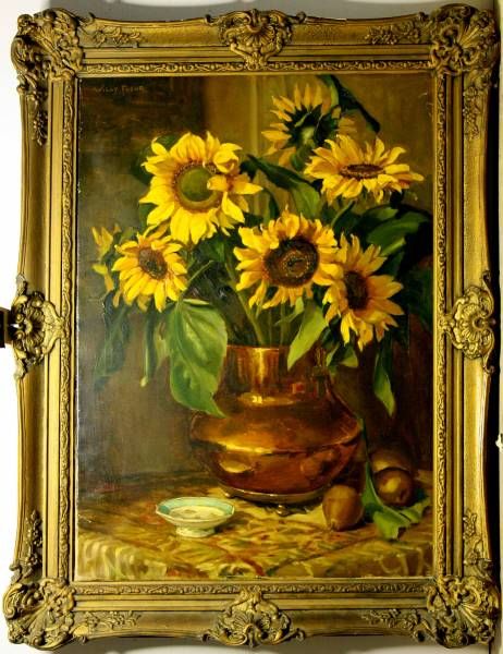 Stilleven met zonnebloemen, peren en chinees schaaltje.